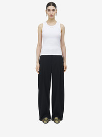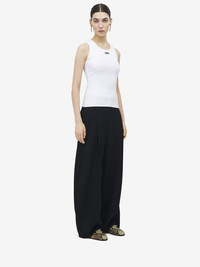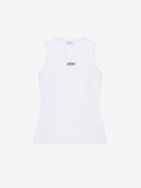 Tank top in optical white cotton rib. Crew neck and silver metal placket with the engraved McQueen logo. Product details - Crew neck - Made with organic cotton yarn - Product code: 839507QLAER9000 - Made in Italy - Material: 98% Cotton, 2% Elastane