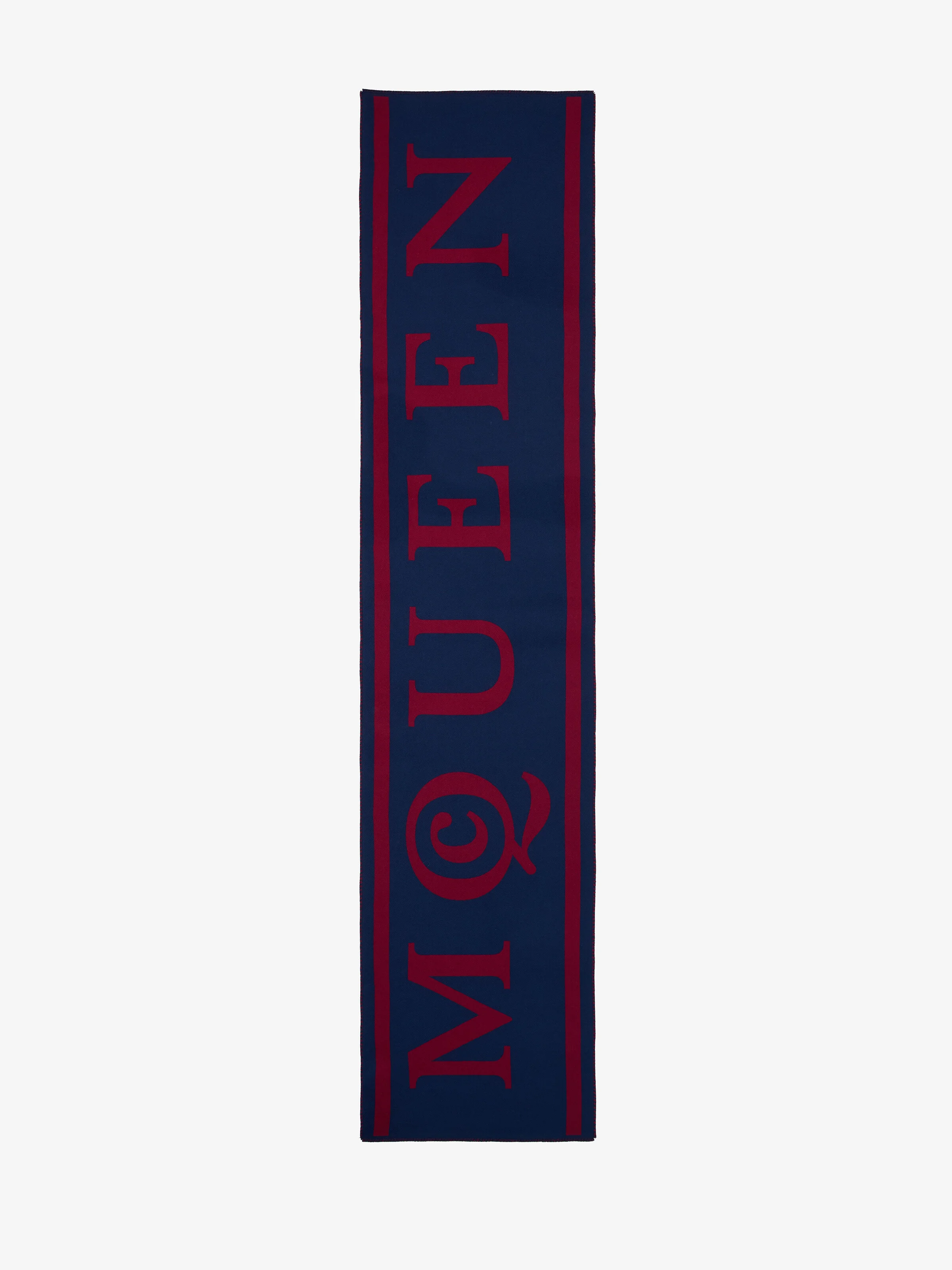 Navy and bordeaux wool jacquard scarf featuring striped borders and an oversized McQueen logo. Product details - Dimensions: 45 x 200cm / 17.7 x 78.7 inches - Product code: 8037783200Q4173 - Made in Italy - Material: Wool