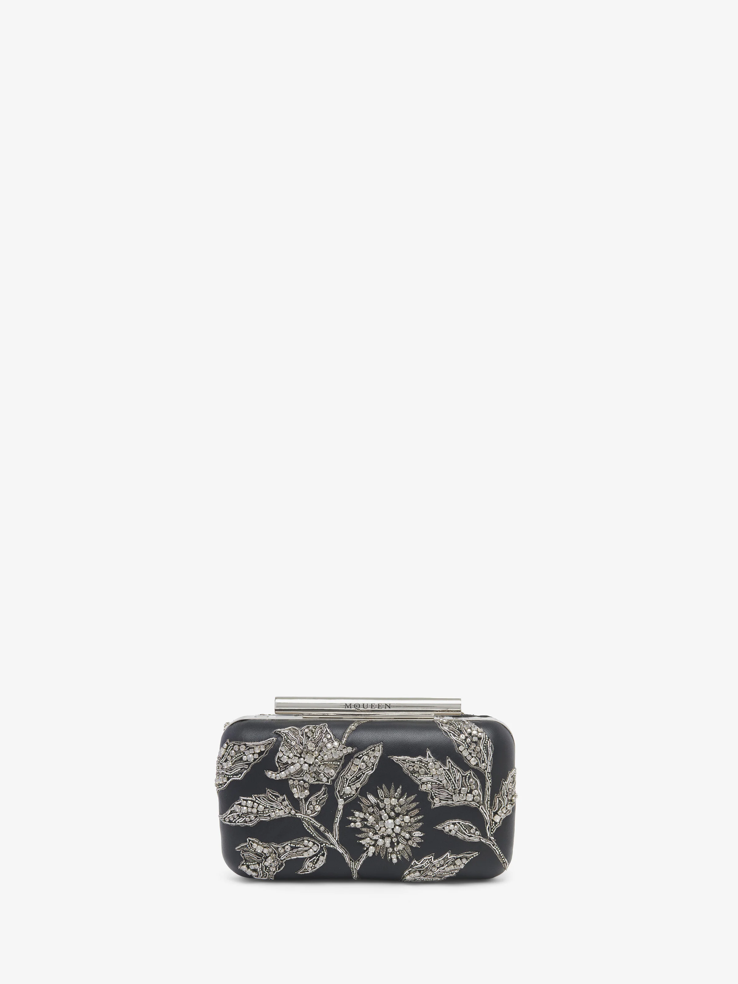 La minaudiere carree McQueen T-Bar - base en cuir nappa noir brodee a la main d'un melange de perles de verre, de pierres et de barres finition argent. Fermoir mousqueton T-Bar argente grave du logo McQueen. Peut etre porte a la main ou a l'epaule grace a la bandouliere chaine amovible. Product details - Dimensions: Length 19 x Height 10 x Depth 4.5cm / 7.4 x 3.9 x 1.7 inches - Strap drop: 53cm / 20.8 inches - T-Bar clasp closure with McQueen logo - One main compartment - Extractable metal hooks for detachable chain strap - Brass hardware with silver tone - Black suede leather lining - Product code: 8137151VPBC8490 - Made in Italy - Material: 100% Lamb Leather