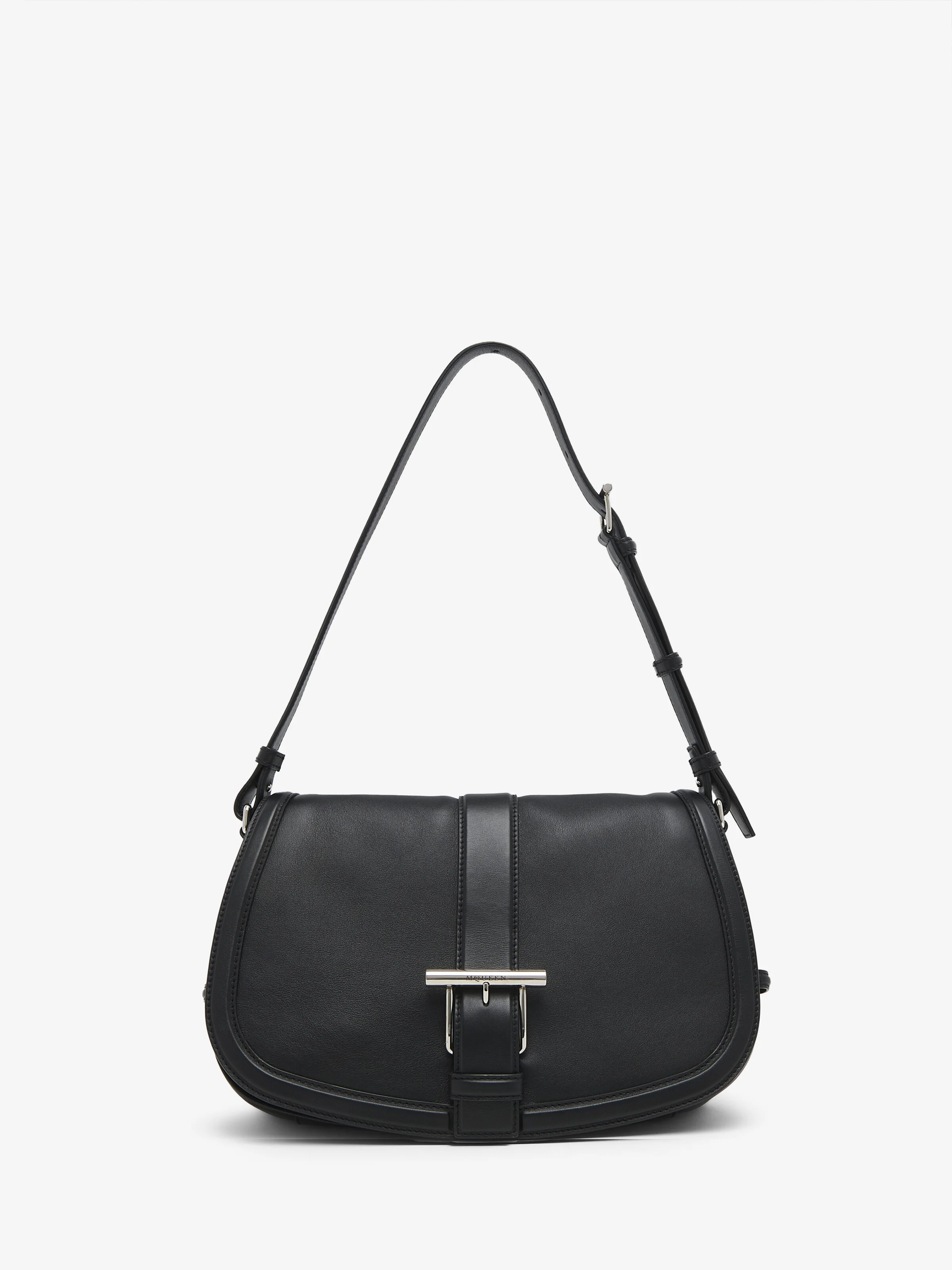 The McQueen T-Bar Large Satchel – sleek silhouette crafted from black smooth calf leather with bombe leather frames. Antique silver-finished T-Bar on the front leather belt engraved with the McQueen logo. Can be carried on the shoulder with the adjustable strap. Product details - Dimensions: Length 35 x Height 23 x Depth 8.5 cm / 13.7 x 9 x 3.3 inches - Strap drop: 25-42cm / 9.8-16.5 inches - Silver-finished T-Bar on the front belt - One central compartment and one open back pocket - Internal zip pocket - Adjustable leather strap - Magnet fastening - Brass hardware with antique silver finishing - Black canvas lining - Product code: 8251401MAAD1000 - Made in Italy - Material: 100% Calf Leather