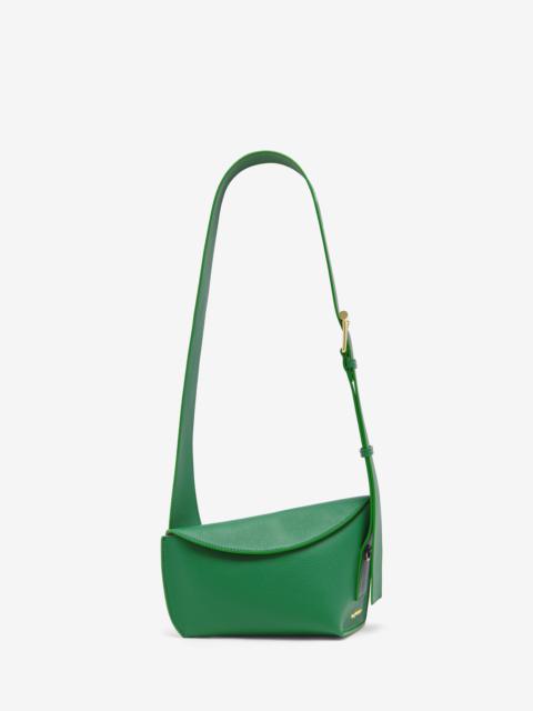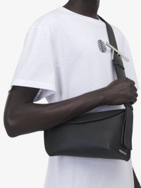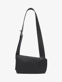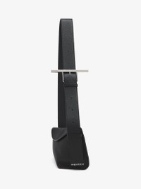 The McQueen T-Bar Sling bag – asymmetrical and handcrafted from a single piece of black textured calf leather. Can be worn crossbody using the adjustable leather strap. Detailed with an oversized statement buckle in silver tone metal engraved with the McQueen logo. Product details - Dimensions: Length 20 x Height 13-16 x Depth 0.5-12 cm / 7.8 x 5.1-6.2 x 0.1-4.7 inches - Adjustable leather strap with shiny silver-finished metal T-Bar buckle - Strap drop: 42-55 cm / 16.5-21.6 inches - T-Bar length: 15 cm / 5.9 inches - McQueen metal lettering and external metal D-ring on the side - Magnetic and zip fastening - One central zip compartment with card slot and metal D-ring - Suede Lining - Product code: 8346551VDBF1000 - Made in Italy - Material: Calf Leather