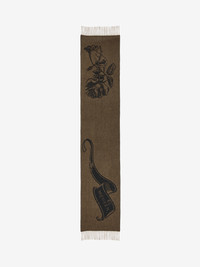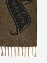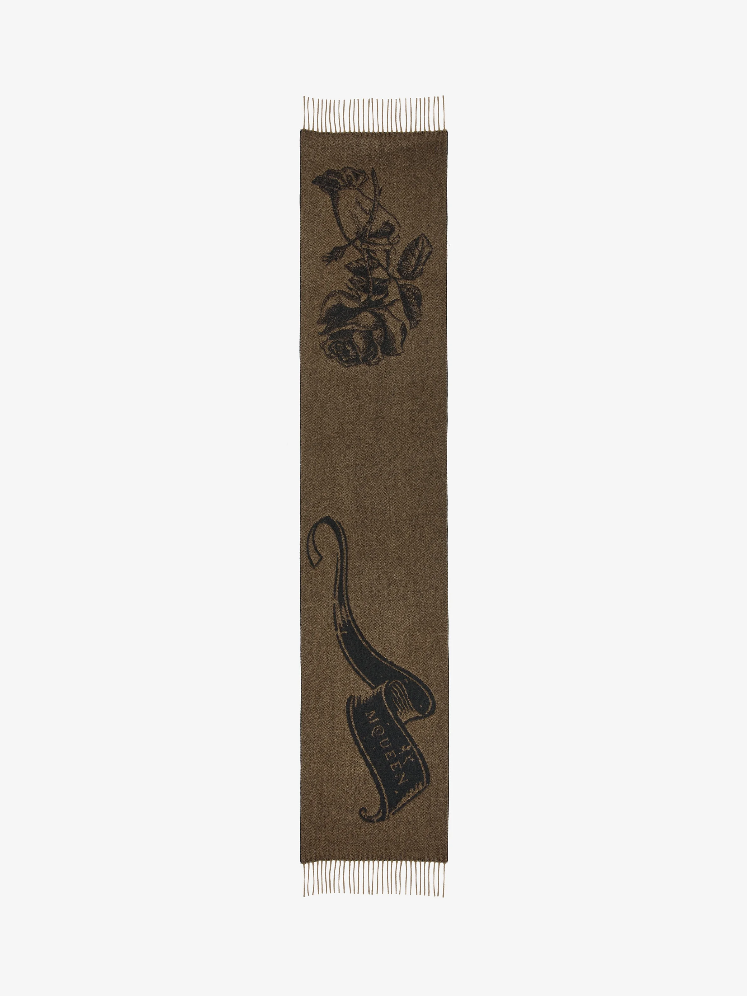Camel and black cashmere wool scarf featuring a rose and scroll motif with the McQueen logo. The scarf is finished with fringe detailing. Product details - Dimensions: 35 x 200 cm / 13.7 x 78.7 inches - Product code: 8357173642Q9860 - Made in ITALY - Material: 50% Wool, 50% Cashmere