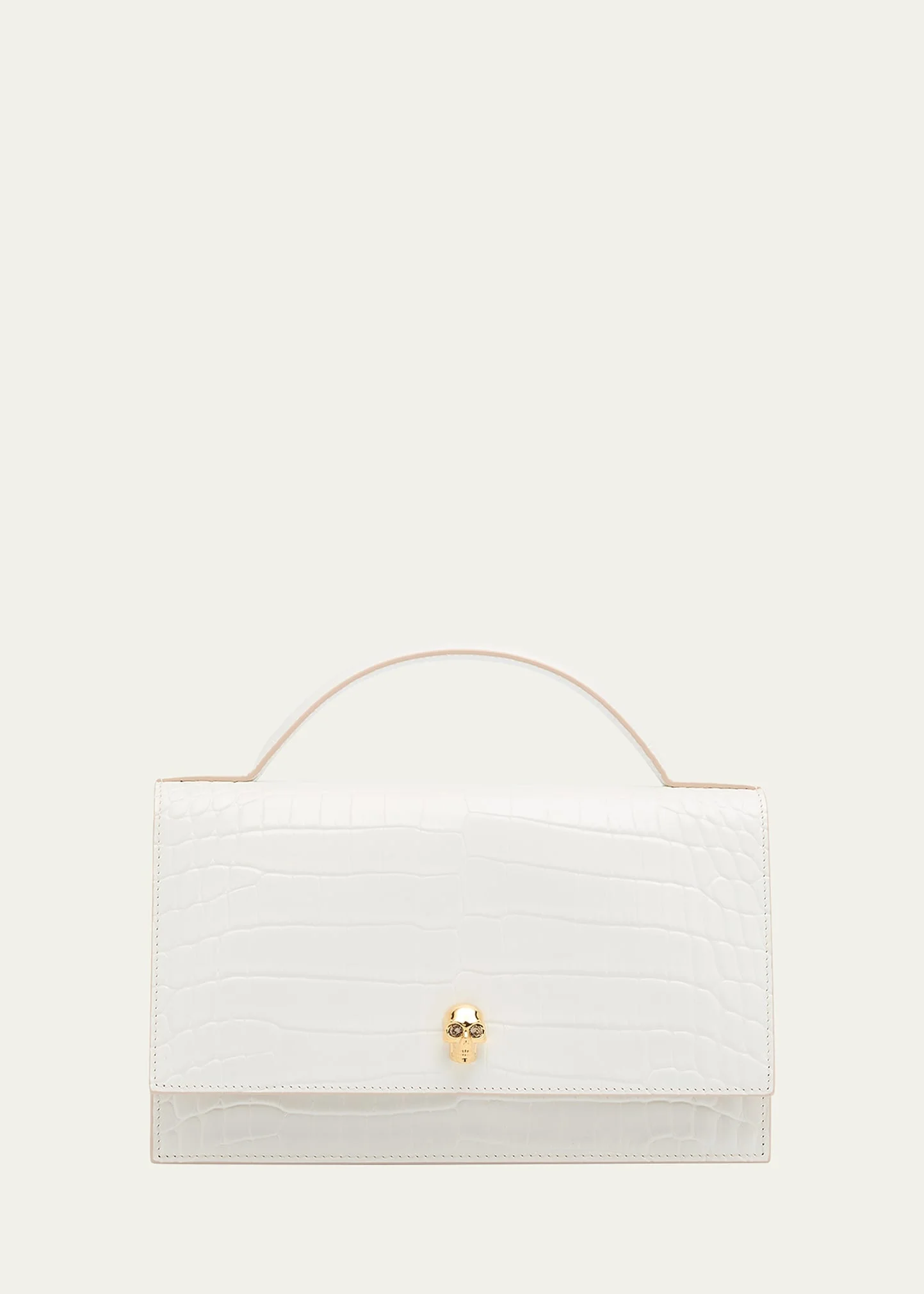 Alexander McQueen top handle bag in croc-embossed calf leather Features signature skull Flat top handle Detachable chain crossbody strap Can be worn as a top handle or crossbody bag Flap top with magnetic closure Exterior, back slip pocket Interior, one card slot Approx. 9.3"H x 7.9"W x 2.4"D Made in Italy Online Inquiries: BGS21_V5R3V| Store Inquiries: #4466177