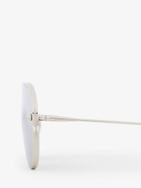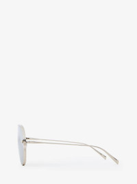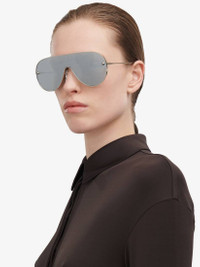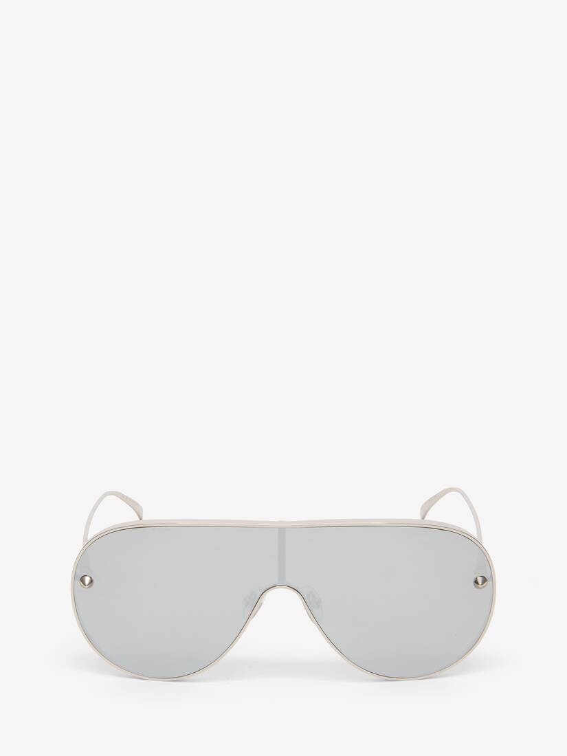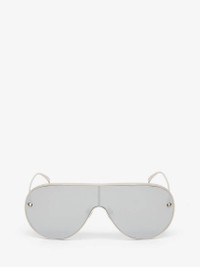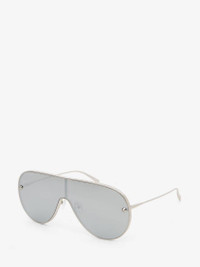 Unisex shiny silver metal mask sunglasses fitted with a mirrored silver lens and detailed with silver metal studs on the front. The style features adjustable nose pads and is finished with a lasered Alexander McQueen signature on the frame side. Product details - All Alexander McQueen Eyewear is 100% certified UV protective (UVA and UVB rays). - Made in Japan. - Product code: 803365I33101273 - Made in Japan
