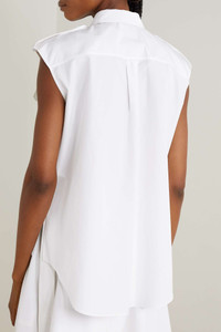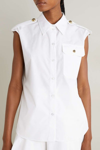 EDITORS'NOTES Flawlessly cut, Alexander McQueen's relaxed shirt feels sharp and polished. It's tailored from cotton-poplin with military-inspired buttons at the epaulettes and chest pocket. SIZE & FIT - Fits true to size, take your normal size - Designed for a relaxed fit - Mid-weight, non-stretchy fabric - Model is 180cm/ 5’11” and is wearing an IT 40 DETAILS & CARE - White cotton-poplin - Button fastenings through front - 100% cotton - Dry clean - Designer color: Optic White - Mother-of-pearl: Indonesia