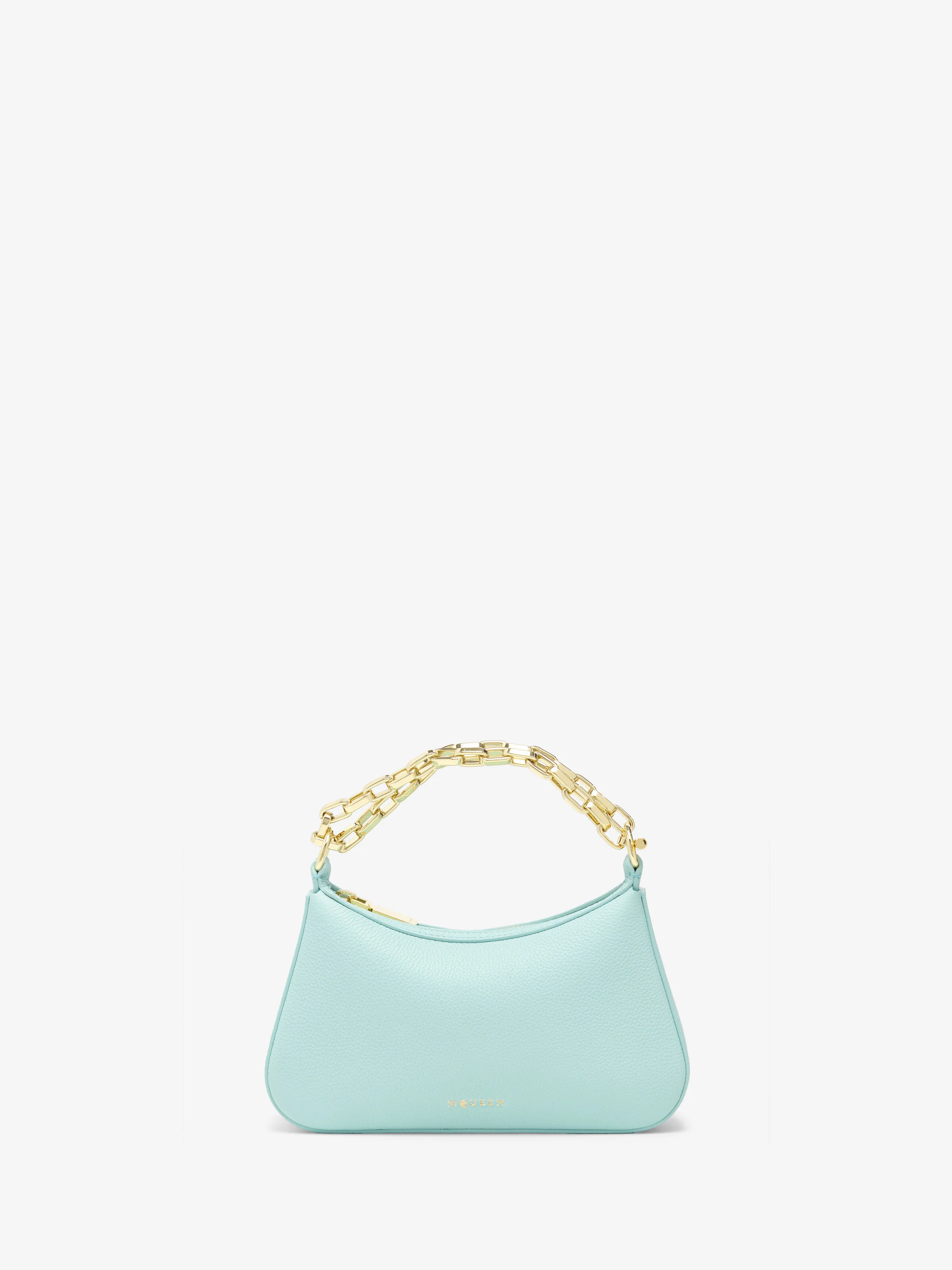 The Mini T-Bar Pouch – elegant curved body in spearmint grainy calf leather. A shiny gold tone metal chain strap ending with a signature T-Bar hook engraved with the McQueen logo. Can be carried on the shoulder or in the crook of the arm by doubling up the chain strap. Product details - Dimensions: Length 21 x Height 12 x Depth 3.5 cm / 8.2 x 4.7 x 1.3 inches - Chain strap can be worn single or doubled up - Zip fastening - Shiny gold tone hardware - One central compartment - Internal card slot - Tonal nappa leather lining - Can accommodate a smartphone - Product code: 8419601VDGG3420 - Made in Italy - Material: Calf Leather