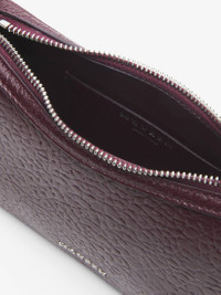 The McQueen T-Bar mini pouch – elegant curved body in oxblood grainy lamb leather. A silver tone metal chain strap ending with a signature T-Bar hook engraved with the McQueen logo. Can be carried on the shoulder or in the crook of the arm by doubling up the chain strap. Product details - Dimensions: Length 21 x Height 12 x Depth 3.5 cm / 8.2 x 4.7 x 1.3 inches - Chain strap can be worn single or doubled up - Zip fastening - Silver tone hardware - One central compartment - Internal card slot - Oxblod nappa leather lining - Can accommodate a smartphone - Product code: 8135531VDGB6408 - Made in Italy - Material: Lambskin