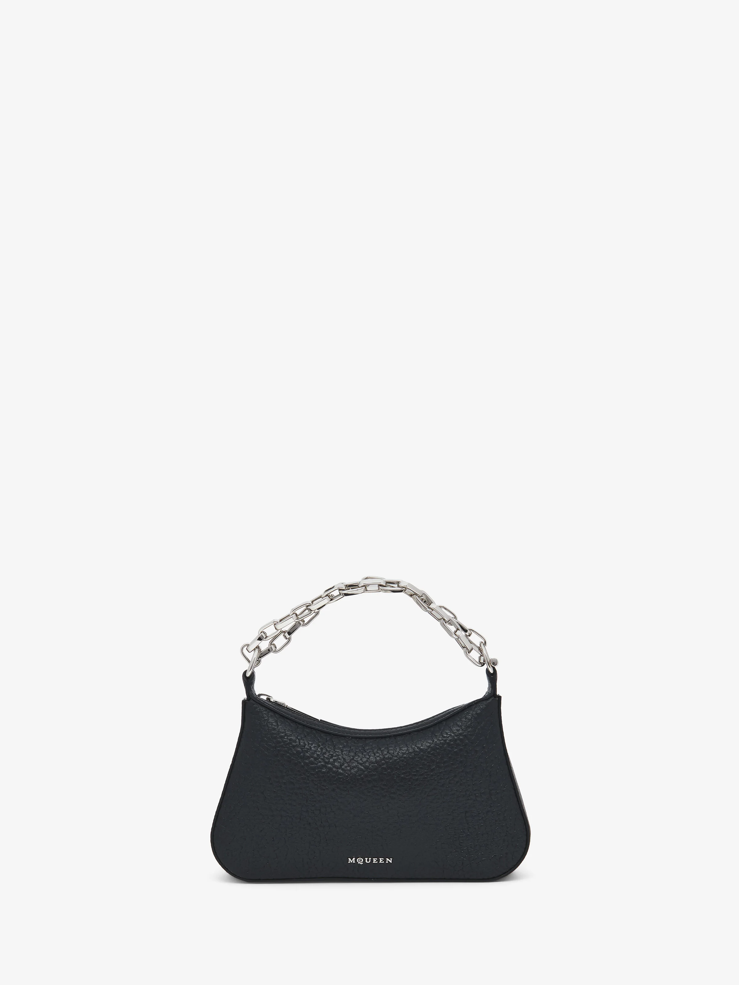 The McQueen T-Bar mini pouch – elegant curved body in black grainy lamb leather. A silver tone metal chain strap ending with a signature T-Bar hook engraved with the McQueen logo. Can be carried on the shoulder or in the crook of the arm by doubling up the chain strap. Product details - Dimensions: Length 21 x Height 12 x Depth 3.5 cm / 8.2 x 4.7 x 1.3 inches - Chain strap can be worn single or doubled up - Zip fastening - Silver tone hardware - One central compartment - Internal card slot - Black nappa leather lining - Can accommodate a smartphone - Product code: 8135531VDGB1000 - Made in Italy - Material: Lambskin