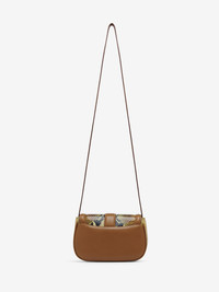 The Mini T-Bar Satchel – sleek silhouette crafted from brown calf leather with a python-effect print and bombe leather frames. Antique gold-finished T-Bar on the flap engraved with the McQueen logo. Can be worn cross-body with the adjustable strap. Product details - Dimensions: Length 19 x Height 13 x Depth 5 cm / 7.4 x 5.1 x 1.9 inches - Strap drop at middle hole: 55cm / 21.6 inches - Antique gold-finished T-Bar on the flap - One central compartment with a card slot - Adjustable leather strap - Magnet fastening - Canvas lining - Product code: 82711317HB18490 - Made in Italy - Material: Calf Leather