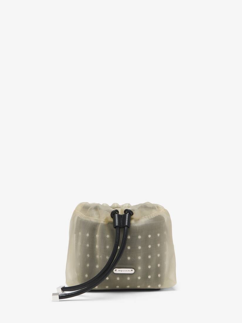 The Nebula crossbody bag - black smooth calf leather with all-over silver tone metal stud detail. Draped with mesh tulle and finished with a drawstring closure. Carried on the shoulder or crossbody with the adjustable leather strap and detailed with with a metal plaque engraved with the McQueen logo. Product details - Dimensions: Length 15 x Height 14 x Depth 8 cm / 5.9 x 5.5 x 3.1 inches - Strap drop: 50-60 cm / 19.6-23.6 inches - Drawstring and magnet fastening featuring black leather cords ending with skull-signed metal cubes - One central compartment - Internal card slot with metal D-ring - Lined in an innovative plant-based fabric - Product code: 8044331VP111000 - Made in Italy - Material: Goatskin