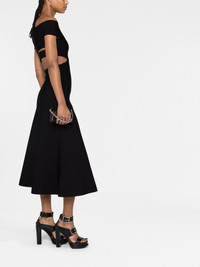 off-shoulder flared midi dress Known to blend hard elements with soft elegance, Alexander McQueen does it again in this off-shoulder midi dress. Spun in a fine rib knit construction, the fluid A-line shape is contrasted with silver-tone piercing details at the chest. Highlights - Black - Fine ribbed - Off-shoulder - Piercing details - Cut-out detailing - A-line skirt - Mid-calf length Made in Italy Composition Viscose 79%, Polyester 15%, Polyamide 5%, Elastane 1% SIZE & FIT Model measurements Height 5 ft 11 in(1.8 m) Bust/Chest 31.49 in(80 cm) Hips 35.82 in(91 cm) Waist 24.8 in(63 cm) Washing instructions Dry Clean Only
