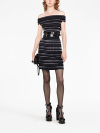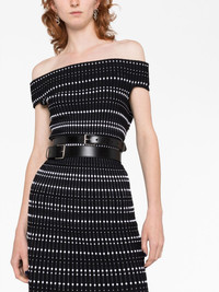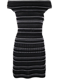 off-shoulder knitted minidress Alexander McQueen's knitted minidress is designed in an off-shoulder silhouette that frames the decolletage. The dotted motifs are arranged in horizontal stripes that pop against the black background. Made in Italy Composition Viscose 96%, Cotton 62%, Polyamide 38%, Polyester 4% SIZE & FIT Model measurements Height 5 ft 10 in(1.77 m) Bust/Chest 27.95 in(71 cm) Hips 33.85 in(86 cm) Waist 23.22 in(59 cm) FittingInformation Designed for a slim fit that sits just away from the body offering a close yet comfortable fit Made with a midweight knit, this piece offers some stretch This piece fits true to size – take your usual size
