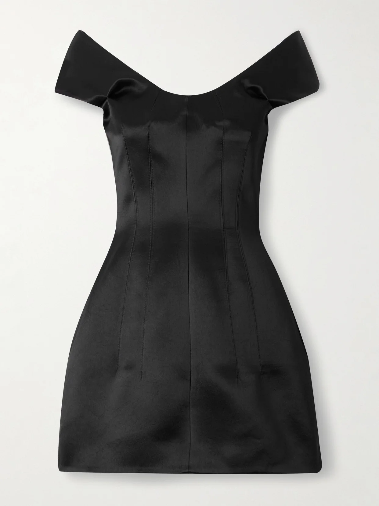 Simple, elegant and timeless, McQueen's mini dress is one you'll feel confident wearing to dinner or cocktail parties. It's made from lustrous satin and has contouring seams through the fitted bodice before flaring out slightly at the hips. The neckline sits just off the shoulders, framing your decolletage. Large to size. See Size & Fit notes.