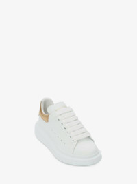 White smooth calf leather lace-up sneaker with rounded toe and trimmed with gold grain leather heel detail. Large flat laces and Alexander McQueen signature on tongue and heel counter. Oversized rubber sole. To lessen our environmental impact and to reduce cotton consumption, we will no longer be providing a dust bag with our sneakers. Material: 100% Calfskin Logo Solid colour Leather/rubber sole Narrow toeline