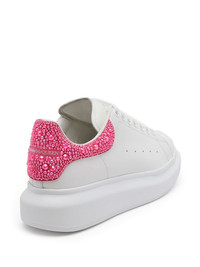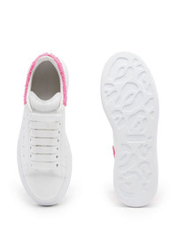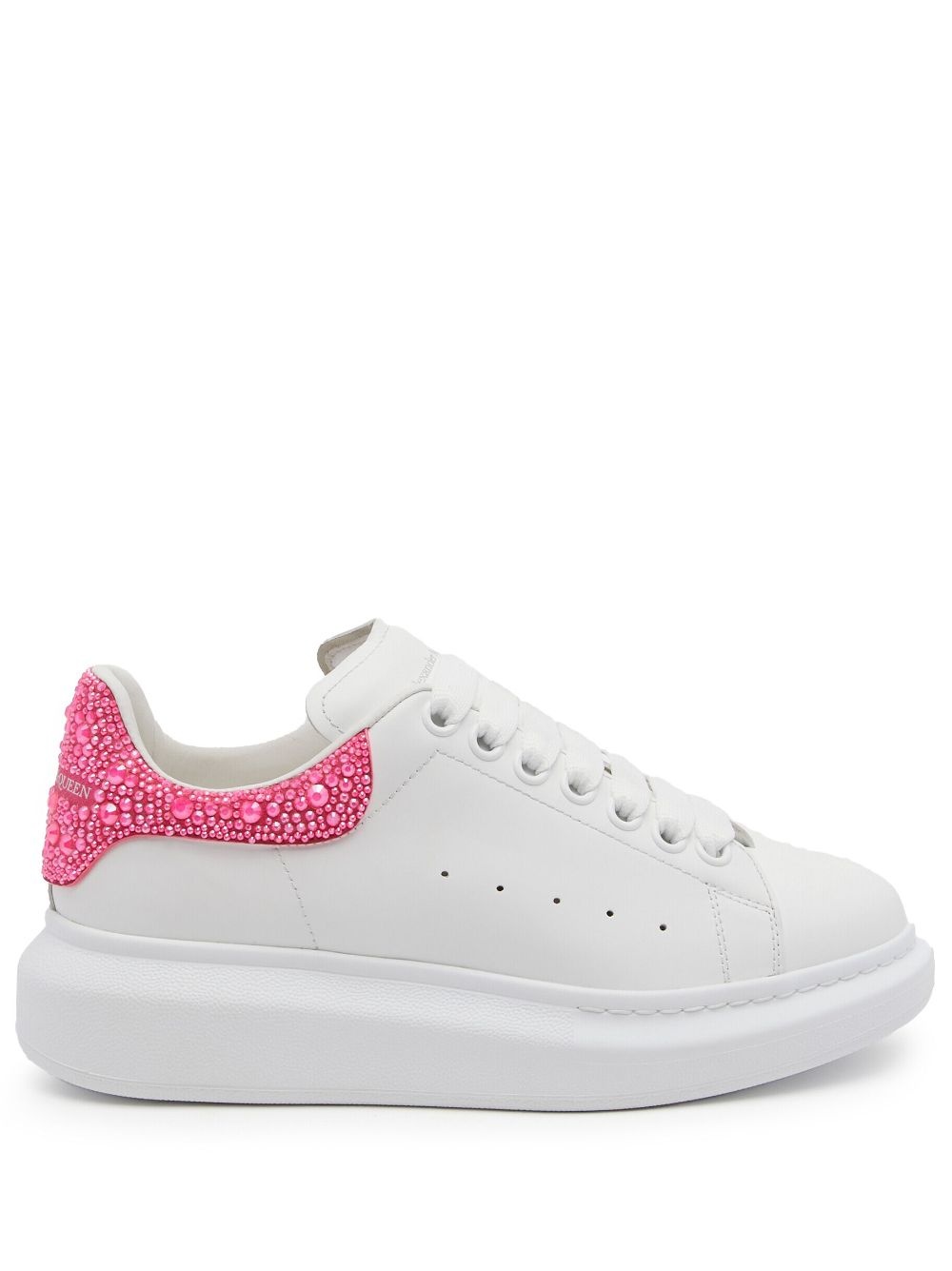 Oversized leather sneakers A brand signature since 2016, Alexander McQueen's exaggerated-sole sneakers need no introduction. This pair has been made in Italy from white leather and is accented by a hot pink heel counter, embellished with rhinestones and a silver-tone foil logo. Highlights - White/pink - Calf leather - Round toe - Front lace-up fastening - Perforated detailing - Branded insole - Chunky rubber sole - Glitter heel counter Made in Italy Composition Lining: Fabric 100% Outer: Calf Leather 100% Sole: Rubber 100%