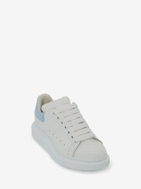 White smooth calf leather lace-up sneaker trimmed with a powder blue suede heel counter. The sneaker features large flat laces and an oversized rubber sole. Finished with an Alexander McQueen signature on tongue and heel counter. Oversized rubber sole with signature stamp design. The sneakers come with an additional lace set. To lessen our environmental impact and to reduce cotton consumption, we will no longer be providing a dust bag with our sneakers. Product details - The style fits true to size - Product code: 553770WIEF19412 - Made in Italy - Material: 100% Calf Leather