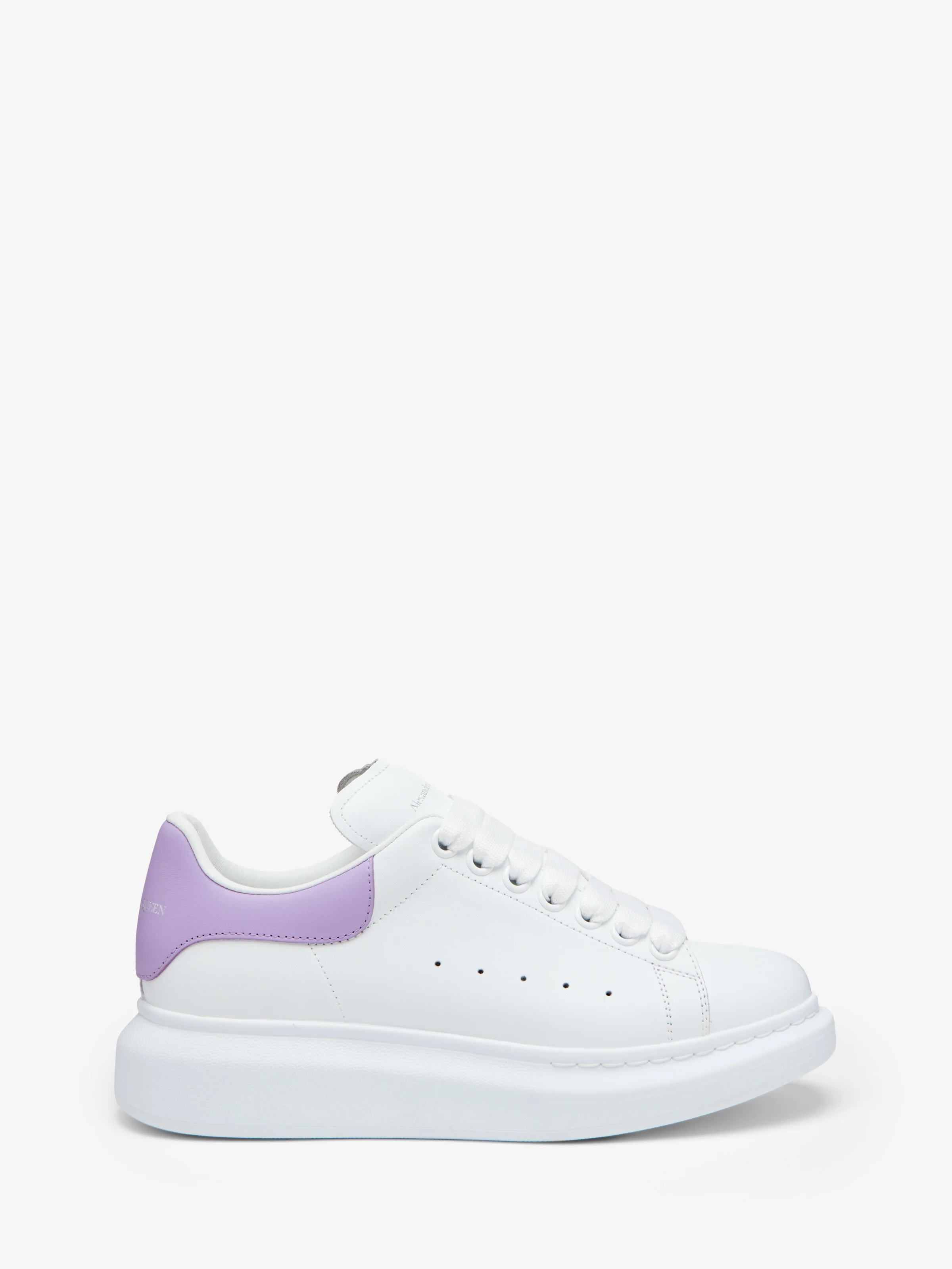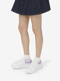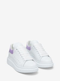 The Oversized Sneaker – statement silhouette in white calf leather, with a lilac heel counter featuring the McQueen signature. Finished with a chunky rubber sole. Product details - Round toe - McQueen signature - Contrasting heel counter - Oversized rubber sole - Additional pair of shoelaces included - Product code: 553770WIAIK9732 - Made in ITALY - Material: Calf Leather