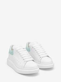 The Oversized Sneaker—statement silhouette in white calf leather, with a spearmint heel counter featuring the McQueen signature. Finished with a chunky rubber sole. Product details - Round toe - McQueen signature - Contrasting heel counter - Oversized rubber sole - Additional pair of shoelaces included - Product code: 553770WIAEE9153 - Made in Italy - Material: 100% Calf Leather