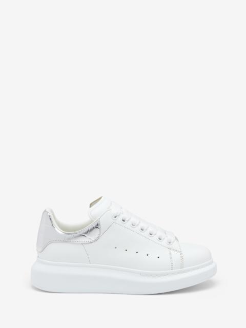 The Oversized Sneaker - Statement silhouette in off white and mirrored leather, with heel counter printed with the McQueen logo. Finished with a chunky rubber sole. Product details - Round toe - Alexander McQueen logo - Contrasting heel counter - Oversized rubber sole - Additional pair of shoelaces included - Product code: 553770WIAEG9085 - Made in Italy - Material: 100% Calf Leather