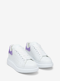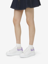 The Oversized Sneaker – statement silhouette in white calf leather, with a lilac crystal-embellished heel counter featuring the McQueen signature. Finished with a chunky rubber sole. Product details - Round toe - McQueen signature - Contrasting heel counter - Oversized rubber sole - Additional pair of shoelaces included - Product code: 666407WIAIZ9117 - Made in ITALY - Material: Calf Leather
