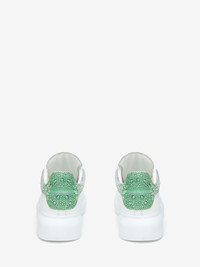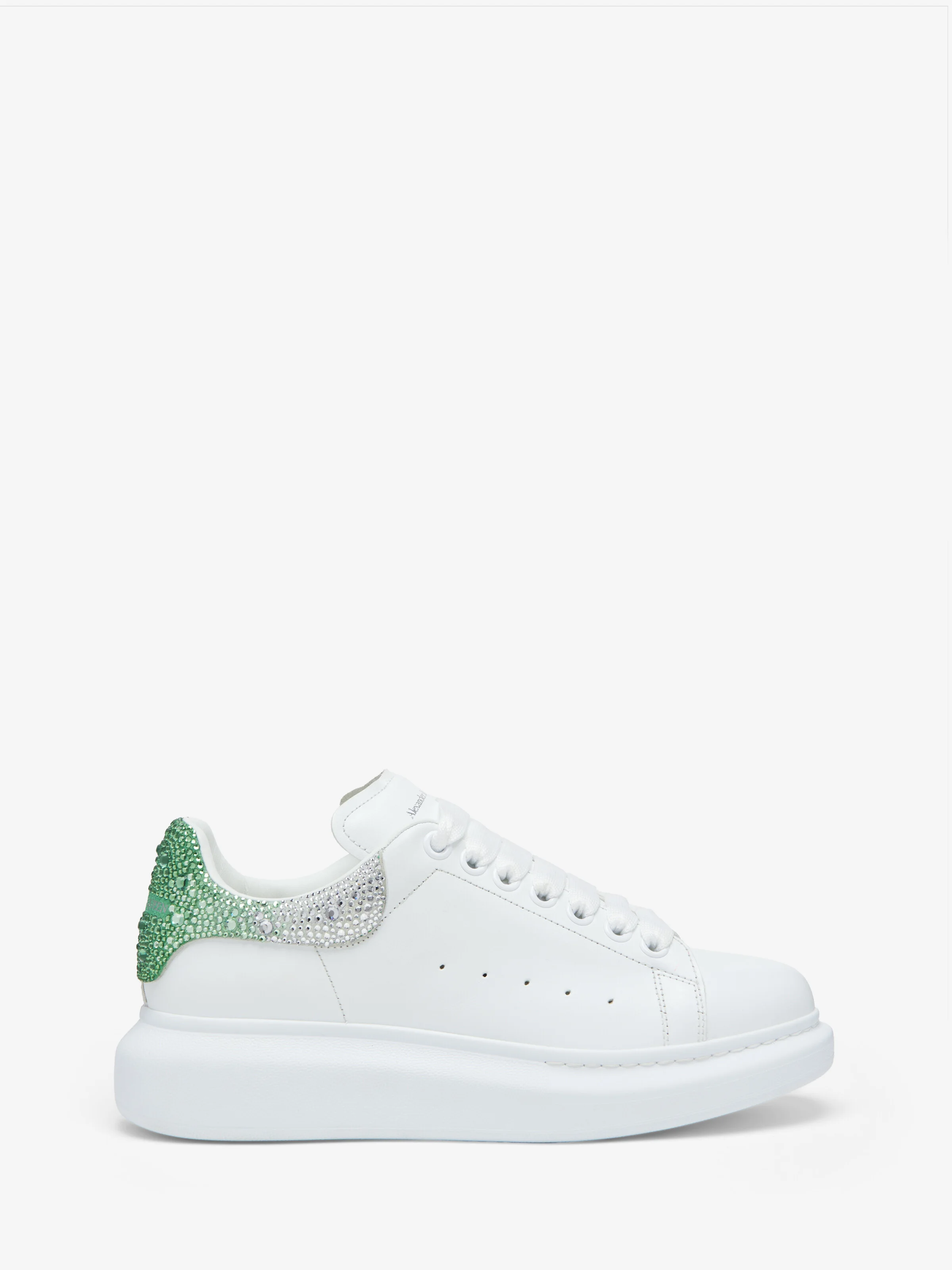 The Oversized Sneaker – statement silhouette in white calf leather, with a gradient green crystal-embellished heel counter featuring the McQueen signature. Finished with a chunky rubber sole. Product details - Round toe - McQueen signature - Contrasting heel counter - Oversized rubber sole - Additional pair of shoelaces included - Product code: 666407WIAIF9160 - Made in ITALY - Material: Calf Leather