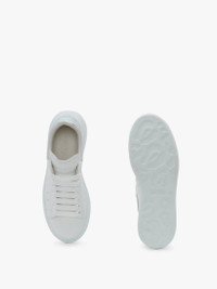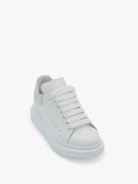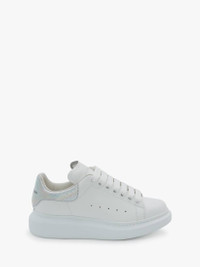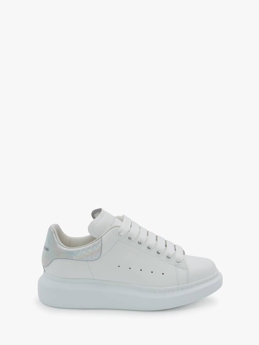 White smooth calf leather lace-up sneaker trimmed with an irridescent embossed glossy croco heel counter. The sneaker features large flat laces and an oversized rubber sole. Finished with an Alexander McQueen signature on tongue and heel counter. Oversized rubber sole with signature stamp design. The sneakers come with an additional lace set. To lessen our environmental impact and to reduce cotton consumption, we will no longer be providing a dust bag with our sneakers. Material: 100% Calf Leather