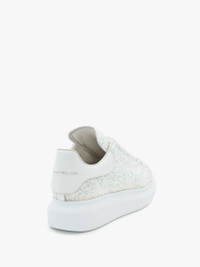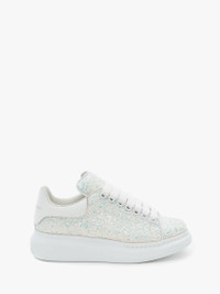 Glitter irridescent lace-up sneaker with leather trims. The sneaker features large flat laces and an oversized rubber sole. Finished with an Alexander McQueen signature on the heel counter. Oversized rubber sole with signature stamp design. The sneakers come with an additional lace set. Material: 93% Polyester, 7% Polyurethane