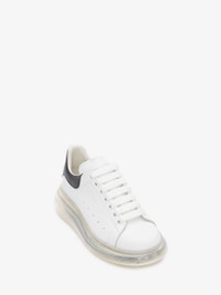 White smooth calf leather lace-up sneaker featuring a transparent oversized sole and black leather heel detail. The sneaker features large flat laces and is finished with an Alexander McQueen signature on tongue and heel counter. Oversized rubber sole with signature stamp design. The sneakers come with an additional set of shoelaces. Material:100% Calf Leather Product Code:611698WHX989061