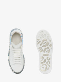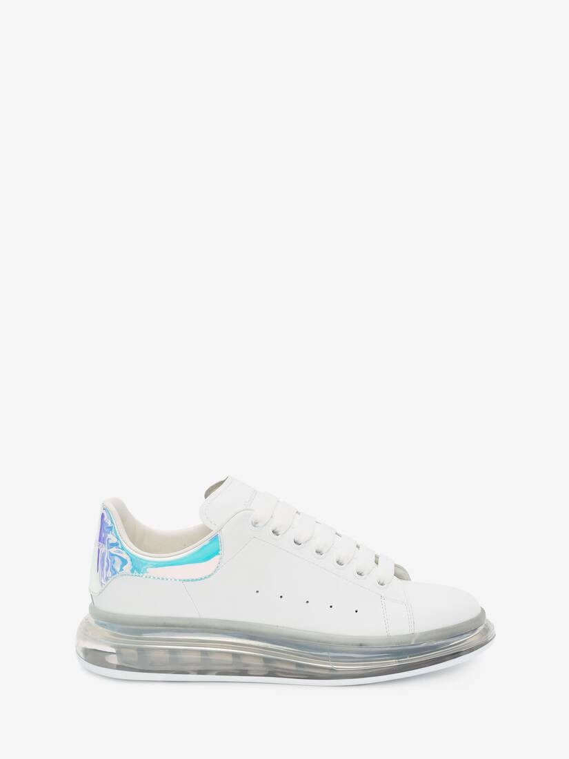 White smooth calf leather lace-up sneaker featuring a transparent oversized sole and iridescent transparent fabrication layered over the white calf leather heel counter. The sneaker features large flat laces and is finished with an Alexander McQueen signature on tongue and heel counter. Oversized rubber sole with signature stamp design. The sneakers come with an additional set of shoelaces. Material:100% Calf Leather Product Code:611699WHXM89035