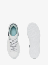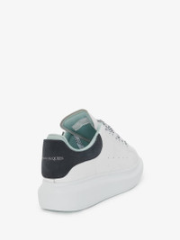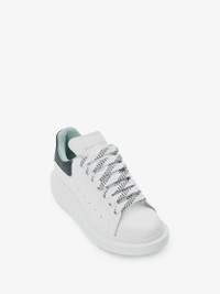 White smooth calf leather sneaker featuring a double suede heel counter in anthracite and mint. The sneaker features large flat laces and an oversized rubber sole. Finished with an Alexander McQueen signature on tongue and heel counter. Oversized rubber sole with signature stamp design. The sneaker comes with an additional set of white shoelaces. To lessen our environmental impact and to reduce cotton consumption, we will no longer be providing a dust bag with our sneakers. Material:100% Calf Leather Product Code:697103WIBNH9890