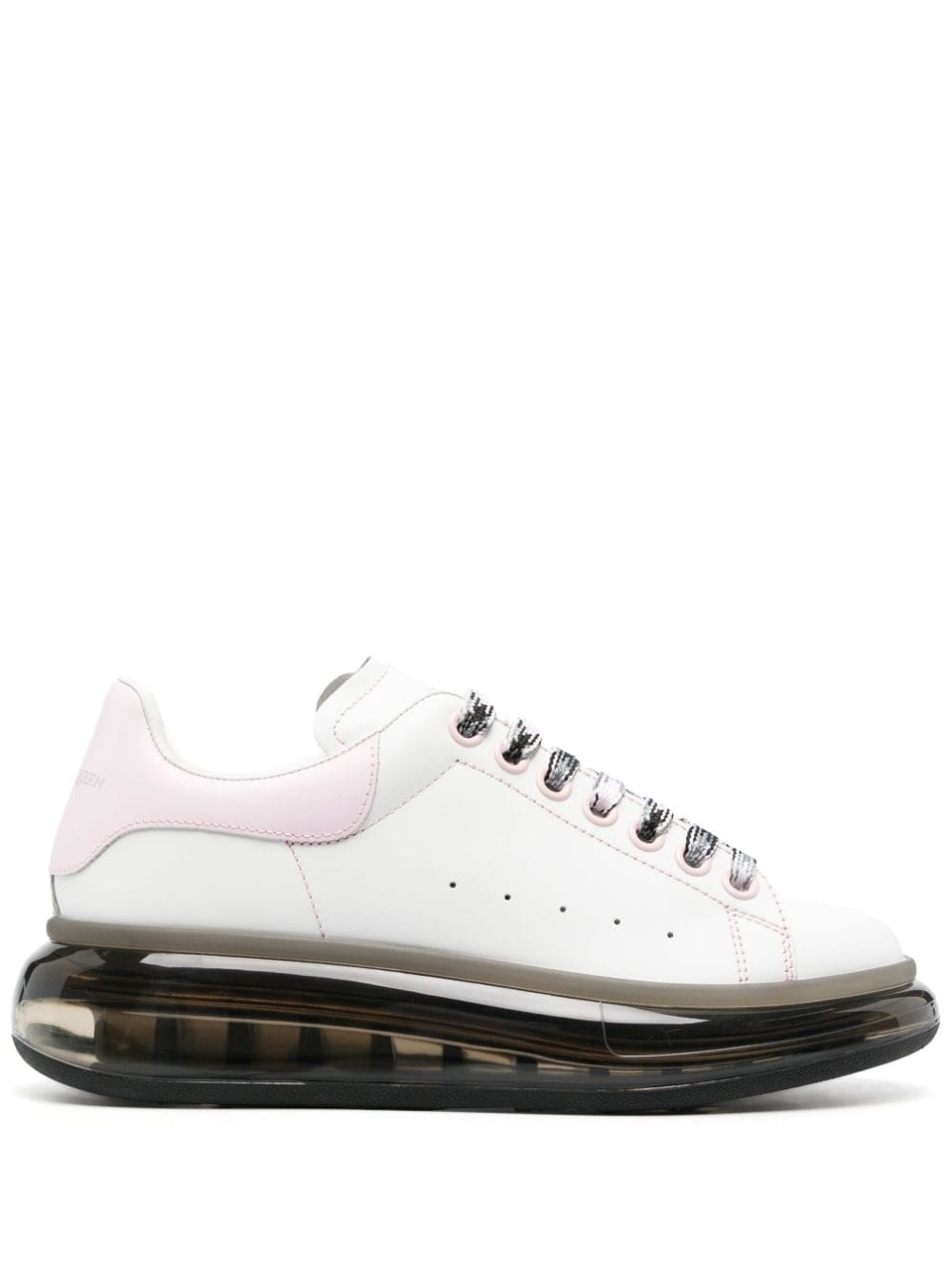 Oversized transparent sole sneakers Sitting atop a signature transparent chunky rubber sole, Alexander McQueen's Oversized sneakers reflect the house's contemporary take on timeless footwear styles. Made in Italy from smooth calf leather, this white pair is enhanced with pale pink accents. Highlights - White - Light pink - Black - Calf leather - Front lace-up fastening - Round toe - Logo-print tongue - Perforated detailing - Contrasting branded heel counter - Transparent oversize rubber sole Made in Italy Composition Sole: Rubber 100% Lining: Calf Leather 100% Outer: Calf Leather 100% SIZE & FIT Measurement HEEL 2.16 in(5.5 cm) Sole height 1.37 in(3.5 cm)
