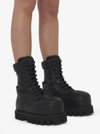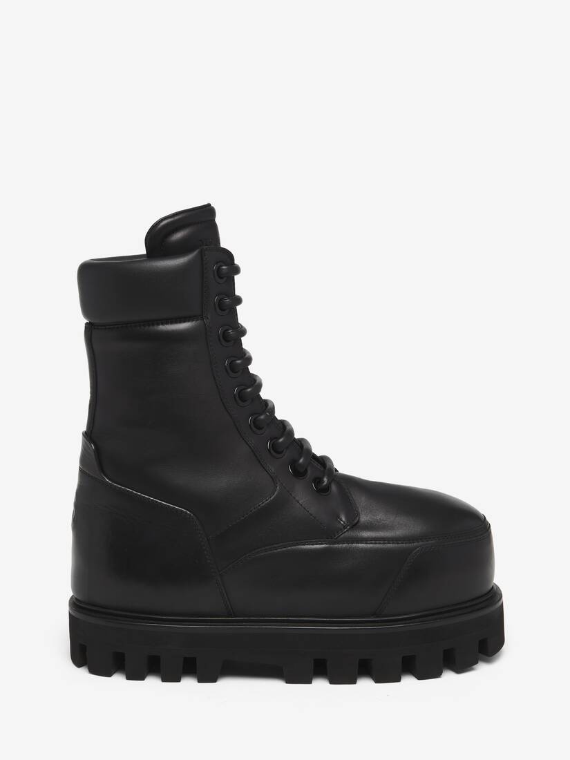 The Parachute boots - Oversized, statement silhouette in black leather. Industrial-inspired heavy duty lug sole, padded toe and tubular laces. Finished with inverted embossed signature skull motif. Product details - Puffy round toe - Padded ankle - Chunky lug sole - Tubular leather laces - Sole height: 45mm - Product code: 808135WHABC1000 - Made in Italy