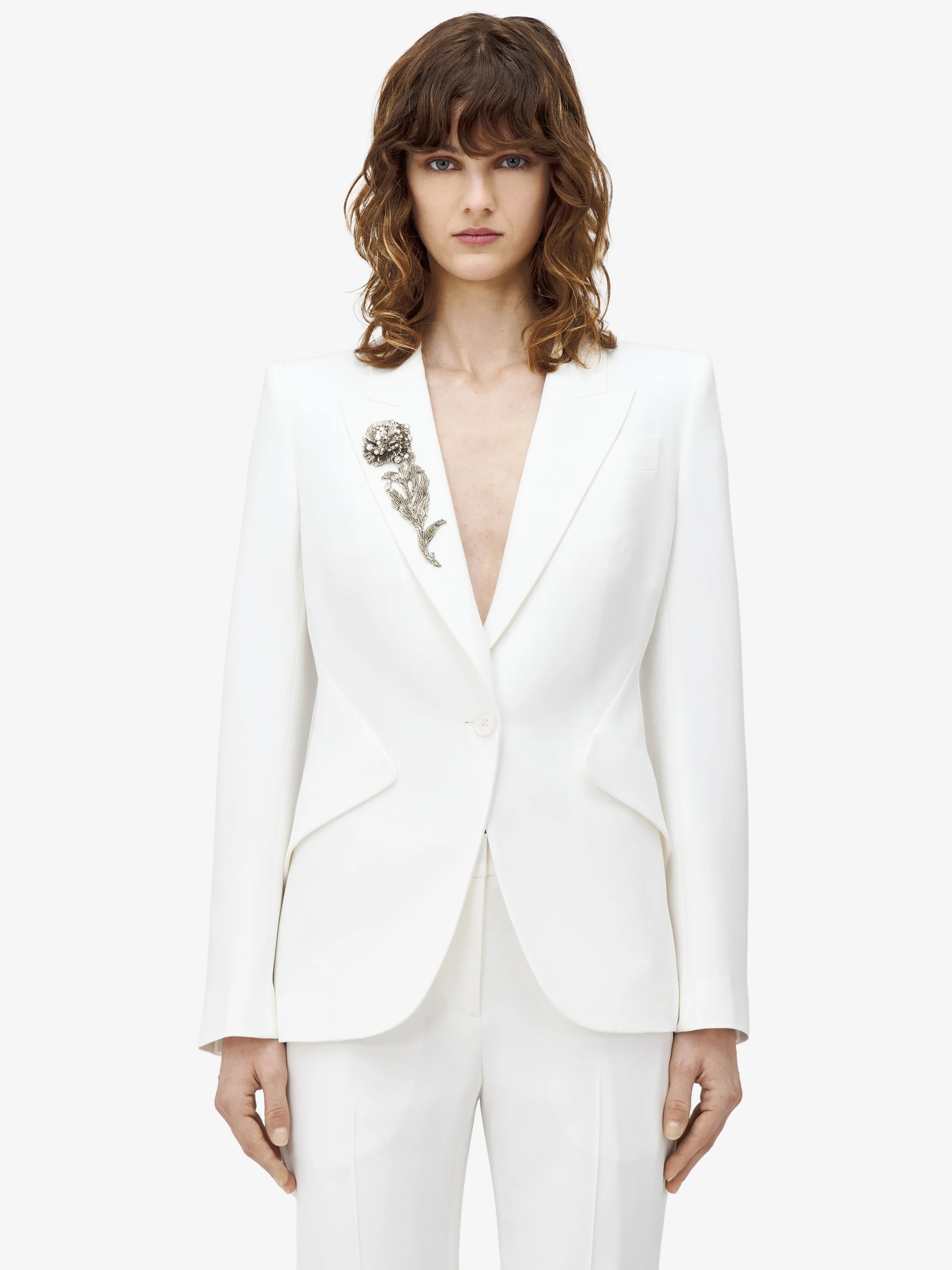 Peak shoulder single-breasted jacket in light ivory leaf crepe. The jacket features peak lapels with a floral crystal embroidery, side flap pockets and a single button fastening. Product details - Peak lapels - Slit pocket on the chest - Single button fastening - Product code: 830147QEAAA9007 - Made in Italy - Material: 52% Viscose, 48% Acetate