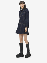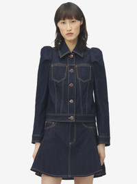 Pinched shoulder jacket in dark blue denim with contrast topstitching. Point collar, two patch pockets on the chest and vertical seam detailing. Finished with a front button fastening. Product details - Point collar - Patch pockets - Front button fastening - Product code: 847964QMADZ4098 - Made in ITALY - Material: 100% Cotton