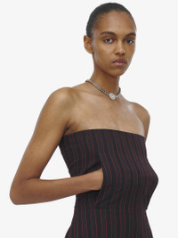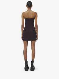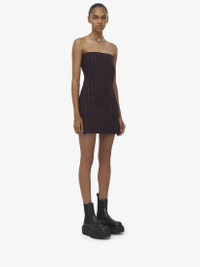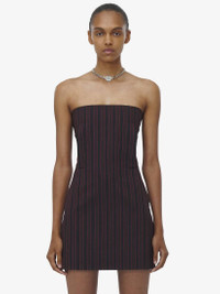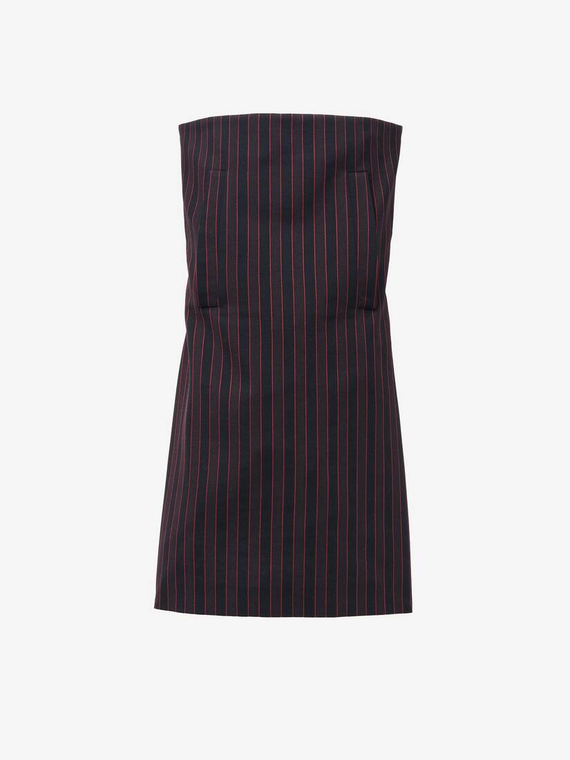 Bustier mini dress in a black and burgundy wool McQueen archive stripe. Finished with a concealed back zip fastening. Product details - Sleeveless - Concealed back zip fastening - Welt pocket - Made with certified wool yarn - Product code: 818354QJAEU1314 - Made in Italy - Material: Wool
