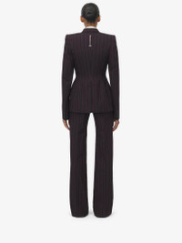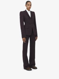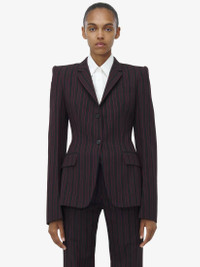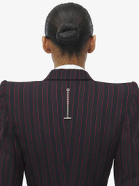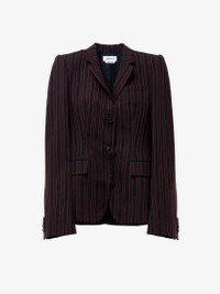 Single-breasted jacket in black and burgundy wool McQueen Archieve stripe. Slit pocket on the chest, two side pockets and a single button fastening. Finished with a T-Bar chain back detail. Complete the look with the matching trousers. Product details - Notch lapels - Side flap pockets - Single button fastening - Made with certified wool yarn - Product code: 818381QJAEU1314 - Made in Italy - Material: Wool