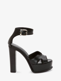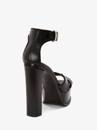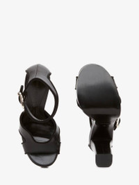 Platform sandal in black leather featuring a round toe and a butterfly-shaped toe strap. Detailed with a silver-finished buckle fastening and a block heel. Product Details: - Heel height: 135mm Material:100% Calf leather Product Code:710039WIC761081