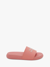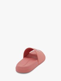 Anemone pink rubber slide with an embedded Alexander McQueen signature on the strap. The slide has a textured oversized rubber sole. Finished with a round toe silhouette. Material: 100% Rubber