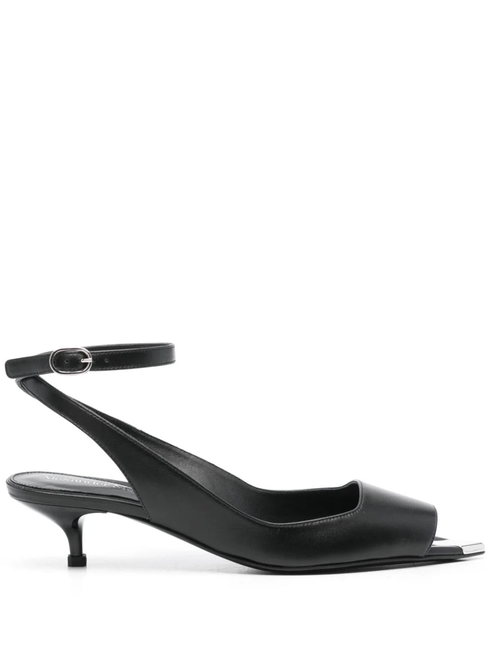 40mm Punk pumps These Alexander McQueen sandals are crafted from smooth leather and embellished with a silver-tone Punk toe cap on the insole, echoing the brand’s rebellious spirit. They're fitted with a buckled strap that elegantly wraps around the ankle. Highlights - Black - Leather - Silver-tone hardware - Metal toecap - Pointed toe - Buckle-fastening ankle strap - Branded insole - Kitten heel Made in Italy Composition Outer: Leather 100% Lining: Leather 100% Sole: Leather 100% SIZE & FIT Measurement HEEL 1.96 in(5 cm)