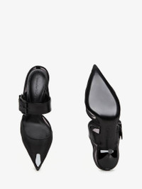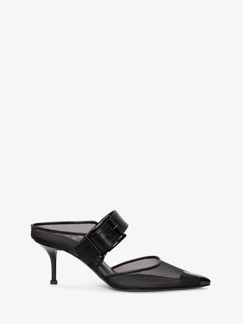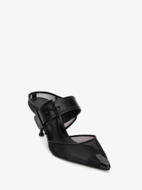 Presented in black mesh, this mule is characterised by a pointed toe silhouette detailed with a tonal punk toe cap. The style is finished with an adjustable buckled strap and a stiletto heel. Product Details: • Pointed toe • Buckled strap • Tonal hardware • Leather sole • Stiletto heel • Heel height: 65mm Material:100% Polyamid Product Code:744485W4AB21000