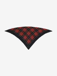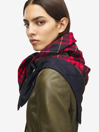 Black and red quilted silk tartan scarf featuring the McQueen logo in the bottom corner. Product details - Dimensions: 90 x 90 x 130cm / 35.4 x 35.4 x 51.1 inches - Product code: 8518653001Q1074 - Made in ITALY - Material: 100% Silk