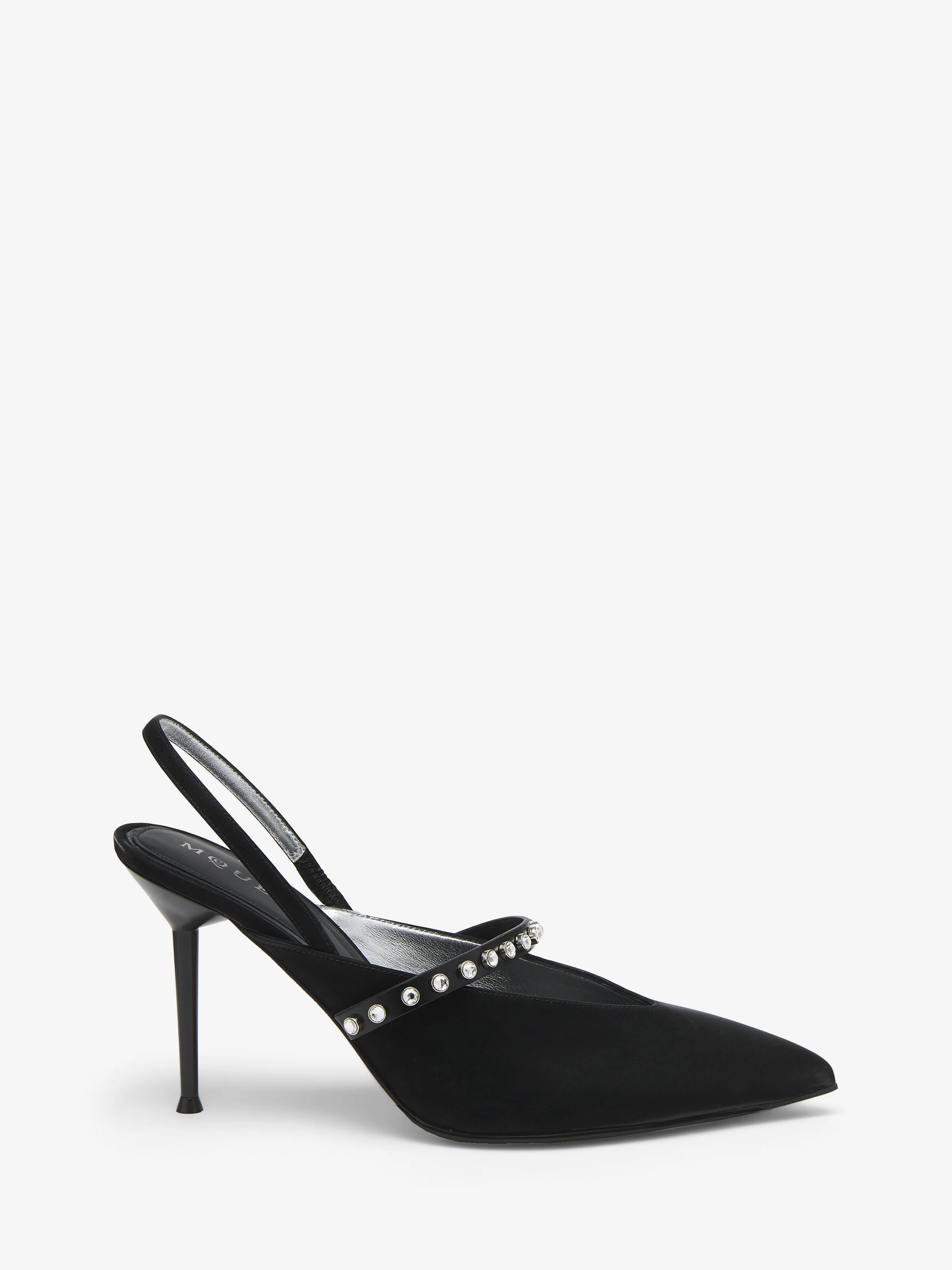 The Revel Slingback—black nylon with a pointed toe silhouette. V-cut upper with crystal-embellished leather strap. Finished with a stiletto heel. Product details - Pointed toe - Leather sole - Heel height: 90 mm / 3.5 inches - Product code: 838457W4ABA1067 - Made in Italy - Material: Polyurethane