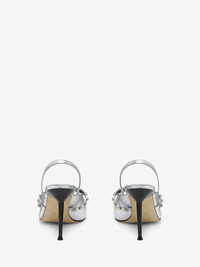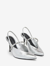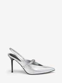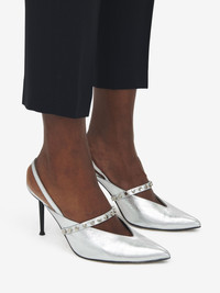 The Revel Slingback—metallic silver leather with a pointed toe silhouette. V-cut upper with silver metal stud-embellished strap. Finished with a stiletto heel. Product details - Pointed toe - Leather sole - Heel height: 90 mm / 3.5 inches - Product code: 838457WIAEU1679 - Made in Italy - Material: 100% Calf Leather