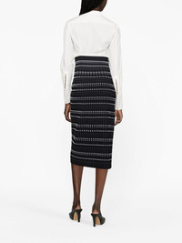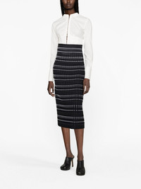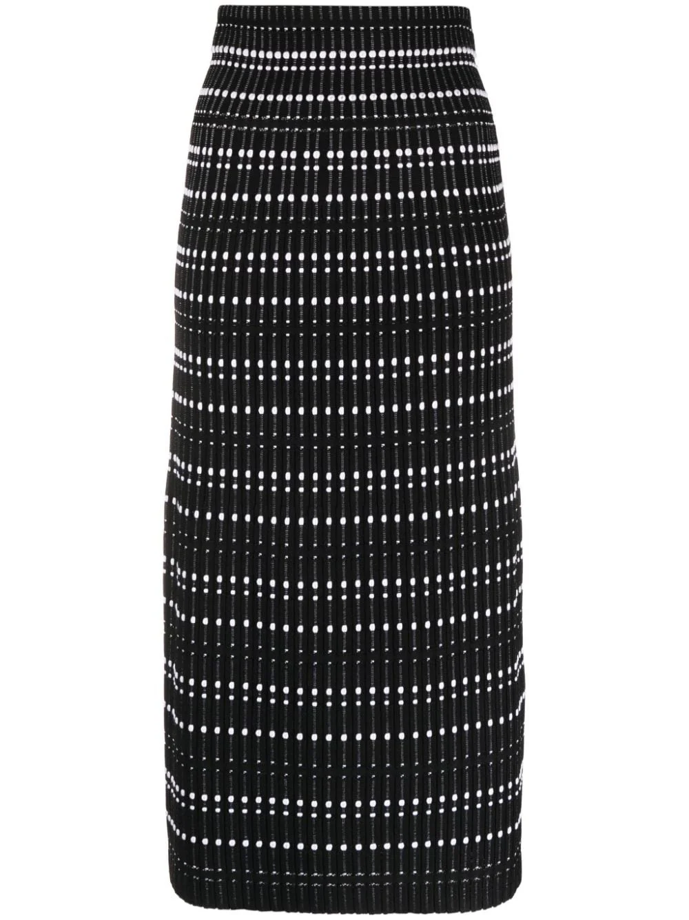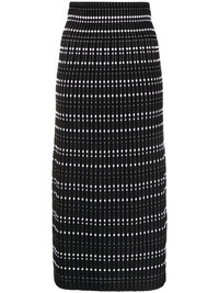 fitted midi skirt Alexander McQueen's midi skirt features a form-fitting silhouette that sits high at the waist and cuts off below the knee. Highlights - Black/white - Cotton blend - Abstract pattern print - High-waisted - Below-knee length Made in Italy Composition Viscose 96%, Cotton 62%, Polyamide 38%, Polyester 4% SIZE & FIT Model measurements Height 5 ft 11 in(1.8 m) Bust/Chest 34.25 in(87 cm) Hips 35.82 in(91 cm) Waist 24.8 in(63 cm) FittingInformation This midi-length skirt is intended to be worn high on the waist Made with a midweight knit, this piece offers some stretch This piece fits true to size – take your usual size Washing instructions Dry Clean Only