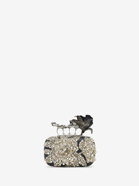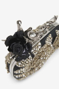 The Rose & Snake Knuckle Clutch – handcrafted with three-dimensional floral embroidery featuring over 2000 tonal crystals in various sizes, embroidered onto a black leather base. Signature knuckle rings are finished with a sculptural motif of a snake coiled around the stem of a singular rose, cast in silver-tone metal and with hand-applied black varnish and crystals. Can be worn handheld. Product details - Dimensions: 10 x 18 x 5 cm / 3.9 x 7 x 1.9 inches - Silver-finished handle adorned with black varnish and black strass sculpted rose - Black suede leather lining - Brass hardware with antique silver finishing - Due to the appearance of the product, we recommend stowing it in your hold luggage when passing through airport security. For the same reason we recommend not taking the bag to public places, such as law courts and sports stadiums, where there may be security checks. - Product code: 835585KR7831090 - Made in Italy - Material: 100% Lamb Leather