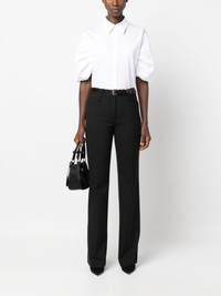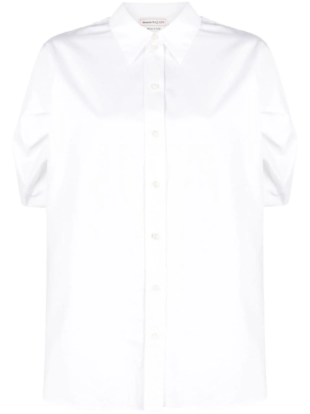 puff-sleeve cotton shirt Alexander McQueen plays with proportions in this crisp white shirt. Crafted in Italy from cotton poplin, it boasts a boxy silhouette and sleek straight-point collar, while its voluminous sleeves lend the garment softness and volume. Highlights - Optical white - Cotton - Poplin texture - Straight-point collar - Short puff sleeves - Front button placket - Curved hem Made in Italy Composition Cotton 100% SIZE & FIT Model measurements Height 5 ft 10 in(1.78 m) Bust/Chest 31.49 in(80 cm) Hips 37 in(94 cm) Waist 23.62 in(60 cm) FittingInformation Designed to be unstructured, offering a loose fit throughout Made from a midweight non-stretch fabric This piece fits true to size – take your usual size Washing instructions Dry Clean Only