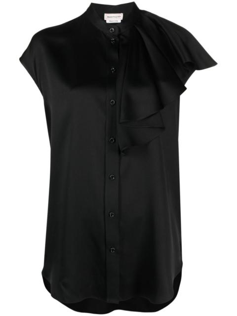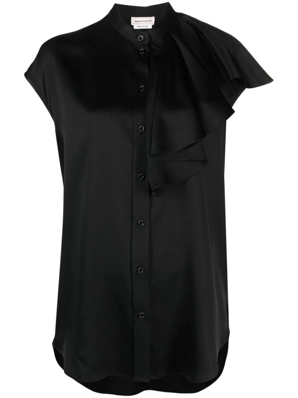 sleeveless ruffled blouse Alexander McQueen imbues this shirt with its irreverent spirit. Cut from fluid black silk, it’s characterised by a sleeveless construction and asymmetric ruffle trim. Highlights - Black - Silk - Ruffled trim - Collarless - Front button fastening - Sleeveless - Full lining - Curved hem Made in Italy Composition Lining: Acetate 74%, Silk 26% Outer: Silk 100% SIZE & FIT Model measurements Height 5 ft 10 in(1.78 m) Bust/Chest 30.7 in(78 cm) Hips 34.64 in(88 cm) Waist 23.22 in(59 cm) FittingInformation Designed to be unstructured, offering a loose fit throughout Made from a midweight non-stretch fabric This piece fits true to size – take your usual size