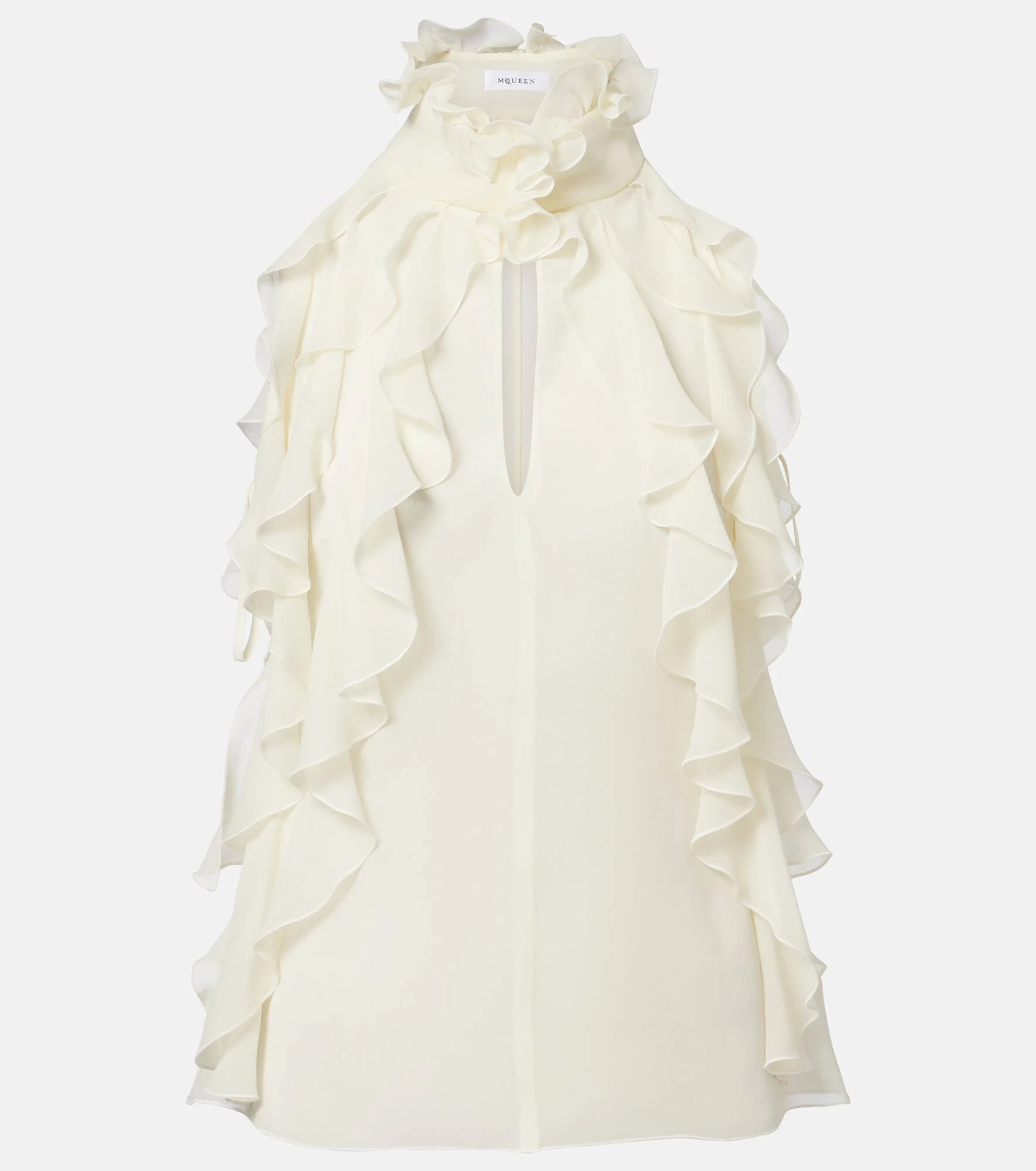 McQueen champions gothic yet glamorous house codes. Made in Italy from silk georgette, this top features a high neckline with tonal ruffles that fall into the bodice, a keyhole cutout, and concealed button fastening. Product Details - Material: 100% silk - Care instructions: dry clean - Made in Italy - Color: white - Designer color name: 9311 - Item color: white - Closure: concealed zipped side - Item number: P01122021 Size & Fit - True to size - Semi-sheer - Cinched waist - Non-stretchy fabric - Falls to the hip - The model seen in the picture is 178cm-5'10" and wearing a size IT 40