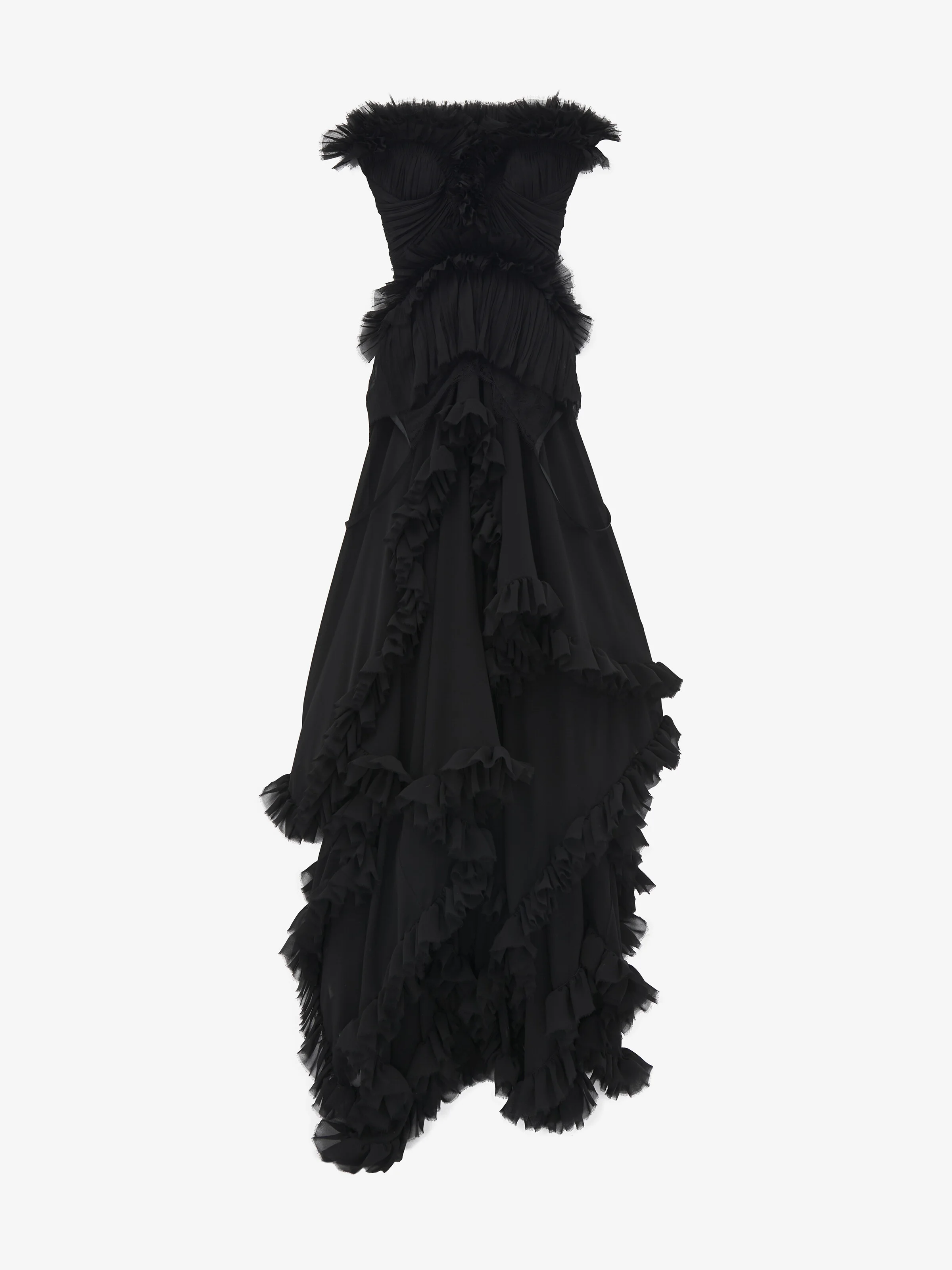 Ruffled evening dress in black silk georgette. Sweetheart neckline, draped bodice and asymmetric skirt. Finished with a back zip fastening. Product details - Sweetheart neckline - Back zip fastening - Product code: 849872QBADS1000 - Made in ITALY - Material: 100% Silk
