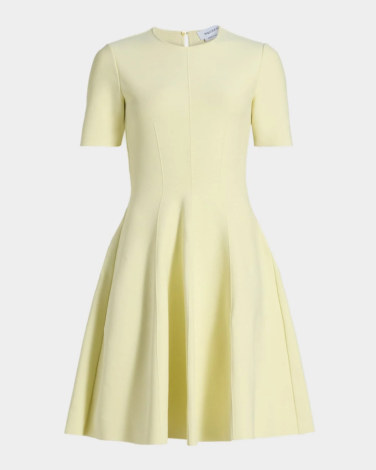 - McQueen dress is structured with contouring waist seams - Round neckline - Short sleeves - Fit-and-flare silhouette - Mini length - Button/keyhole back - Viscose/polyester/mother-of-pearl - Made in Italy